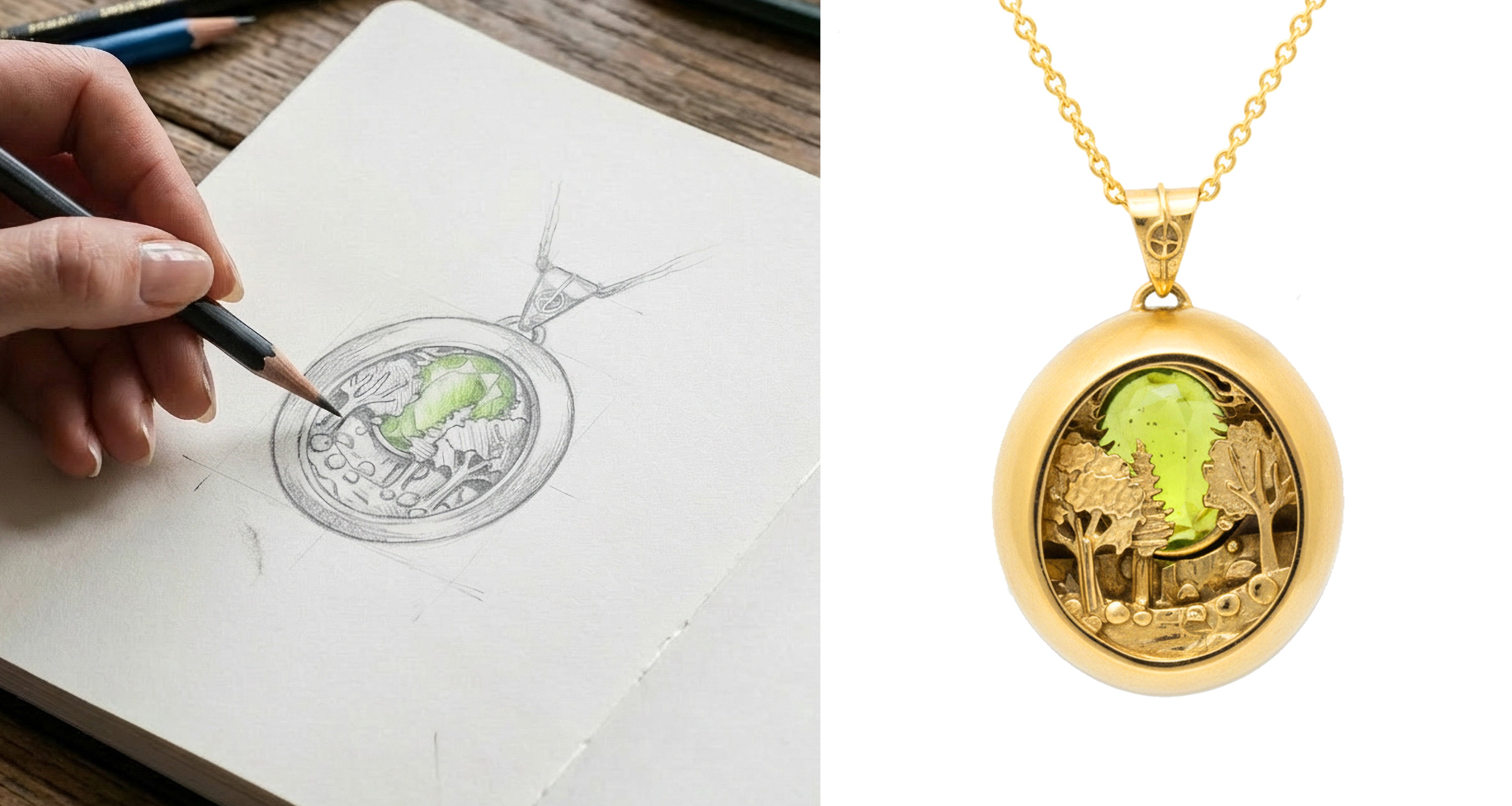 Each pendant holds a hand-sculpted scene, a moment, a memory, or a beloved character. A piece of jewelry that is also a tiny work of art.